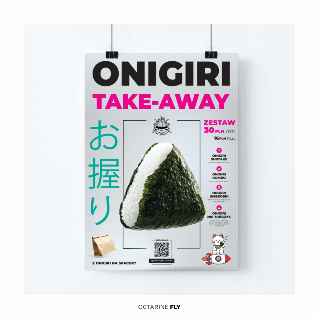 Yatta Vegan Ramen to roślinna restauracja na warszawskim Żoliborzu, która łączy japońską estetykę z nowoczesnym podejściem do kuchni wegańskiej. To miejsce, w którym liczy się nie tylko smak, ale też design – dlatego właściciele zwrócili się do mnie z prośbą o zaprojektowanie plakatu, który będzie widoczny z daleka i zachęci przechodniów do spróbowania ich onigiri – japońskich przekąsek na wynos.